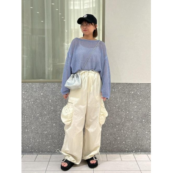 A loose silhouette top is combined with cargo pants to create a rough sporty casual outfit.♪