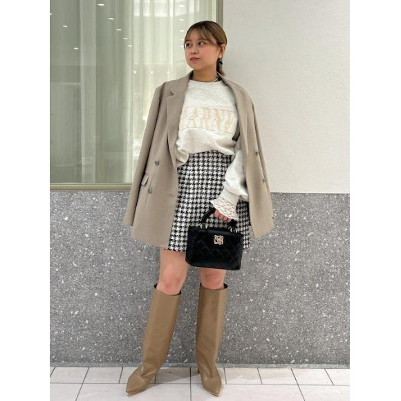 The bag, tweed skirt, and jacket make it a casual look by combining sweatshirts and long boots.♪