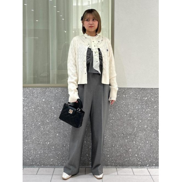 A girly monotone coordinate with a dot pattern blouse and a pin on a velour ribbon.♪