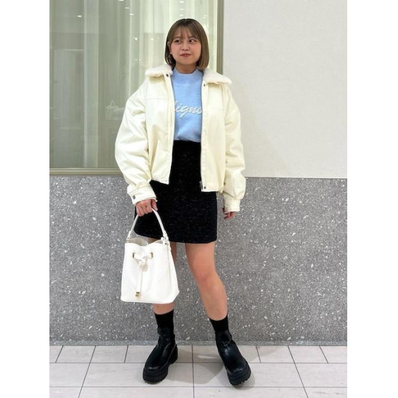 Although it is monotone, it has a cute atmosphere by matching the tweed mini skirt and heart cut bag!