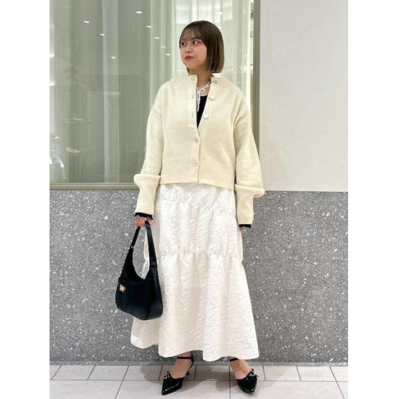 Assorted button lame knit cardigan and a pure white jacquard skirt are combined into a feminine one-tone dress.♪