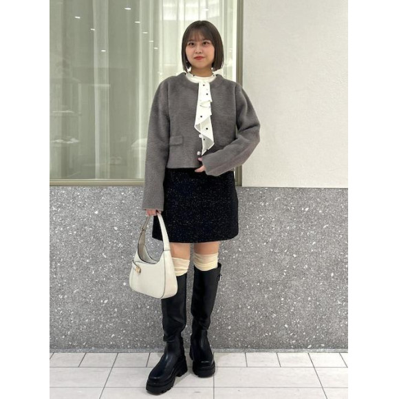 The metal button cardigan is made with a dot pattern blouse and a lame tweed skirt that leaves a cute look.♪