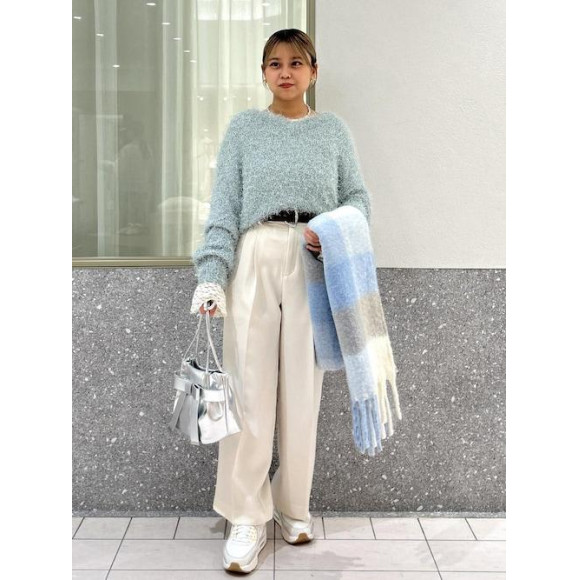 Light blue lame-like knit with light blue scarf wrapped around a light blue muffler.♪