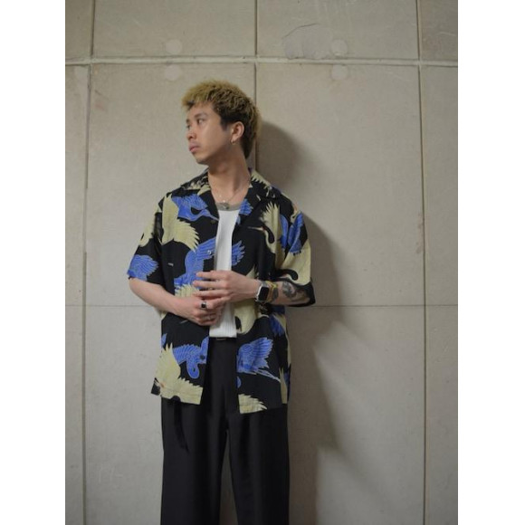 A strong lineup of 1 black color based on 100% glossy rayon material. Traditional Japanese kimono fabric that contributed to the prosperity of Hawaiian shirts. Among them, only the high-ranking black is the symbol of choice blessing, a single fabric with an impact on the entire surface of the crane, and by coloring it and coloring it out of the color, the richness of the color and the softness of the rayon can be maximized, and the appearance has a luxurious feeling.